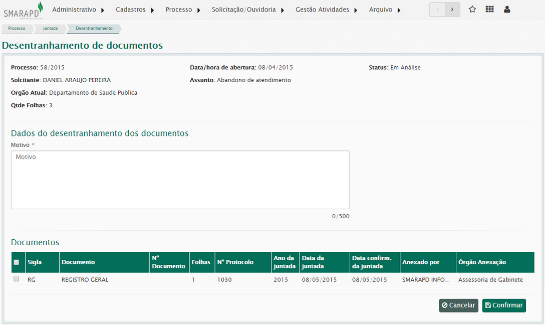 Informe o motivo, selecione os documentos a serem desentranhados e confirme o desentranhamento.