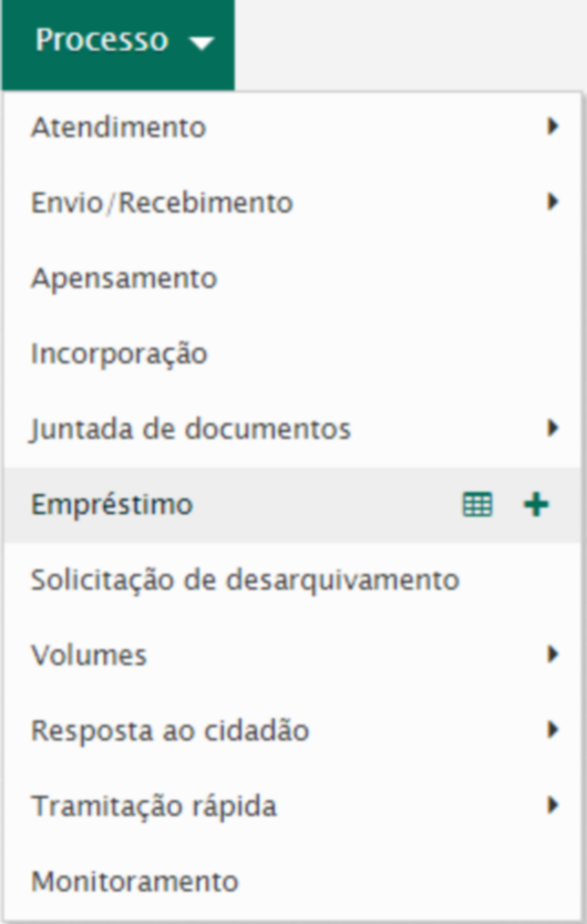 O empréstimo de processos é feito através do menu Processo / Empréstimo / Novo.