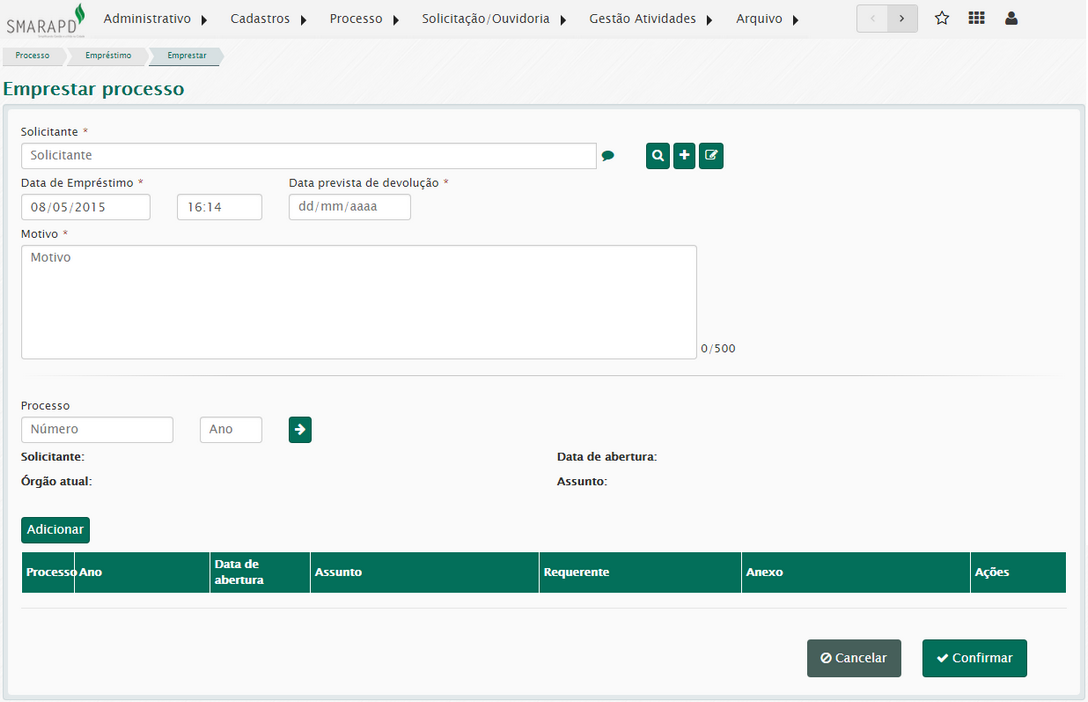 Nesta tela você poderá realizar o empréstimo de processos a outras pessoas para, por exemplo, um advogado realizar o estudo do processo.
