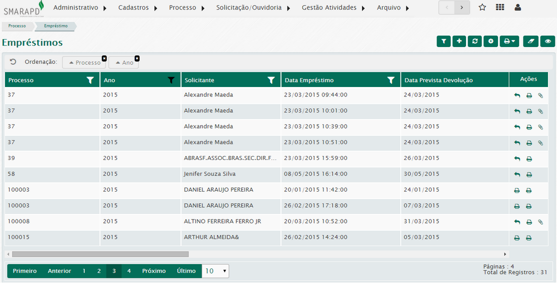 Através da coluna Ações você poderá reimprimir o termo de empréstimo e devolução de processos, bem como realizar a devolução de um processo.
