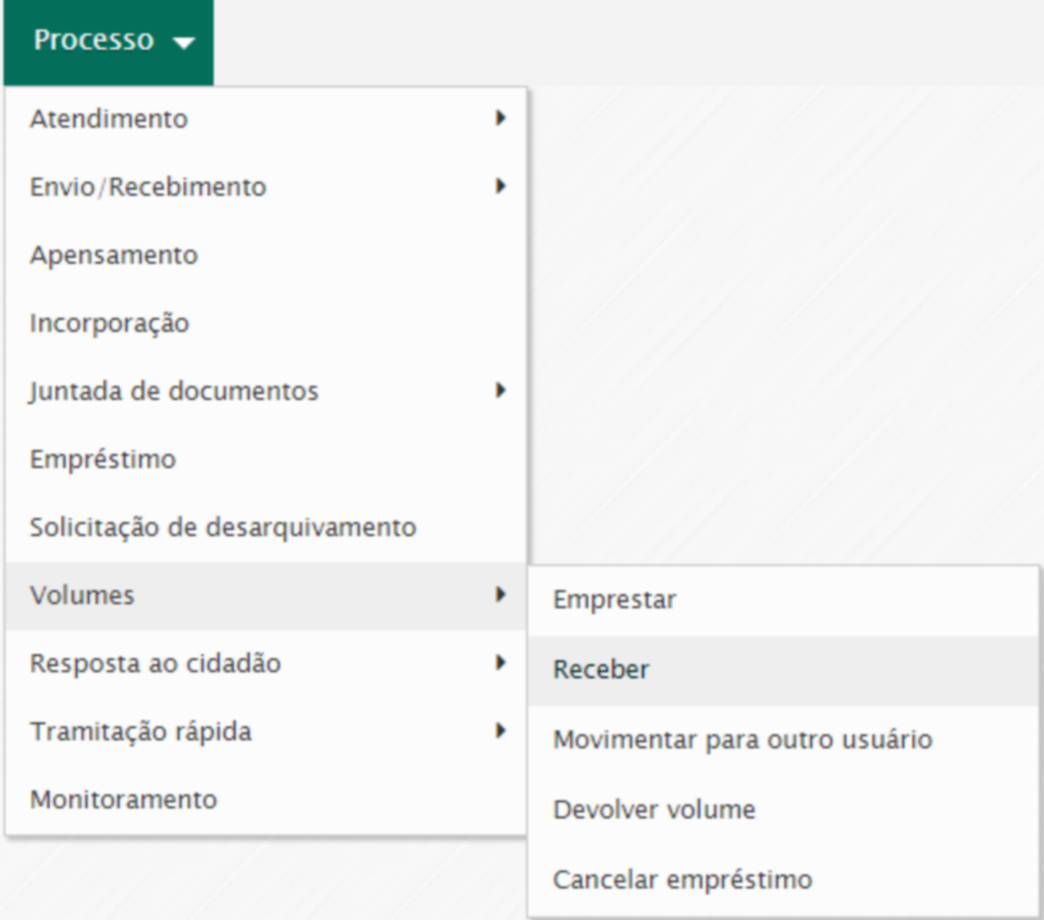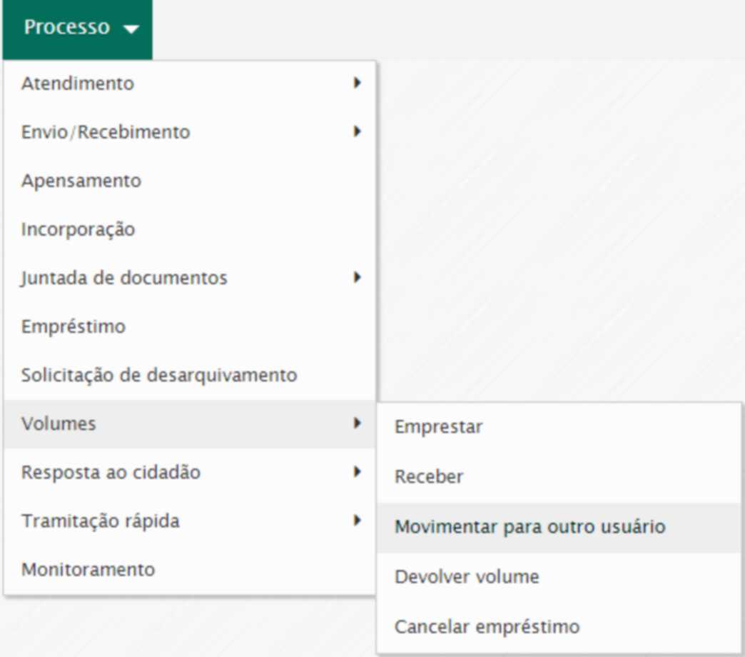 Para movimentar volumes para outro usuário acesse Processo / Volumes / Movimentar para outro usuário.