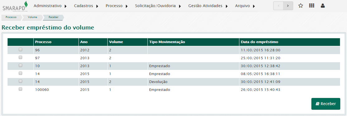 Uma vez emprestado, é necessário que o solicitante do empréstimo receba o volume. Isso é feito através do menu Processo / Volumes / Receber.