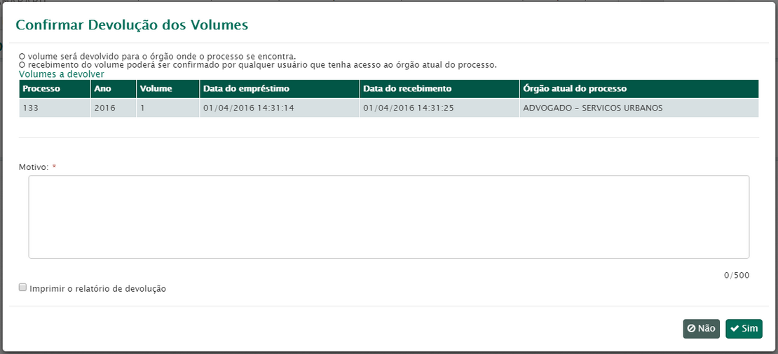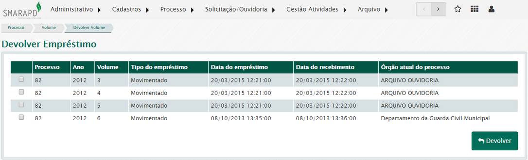 Para devolver um volume emprestado, acesse o menu Processo / Volumes / Devolver volume.