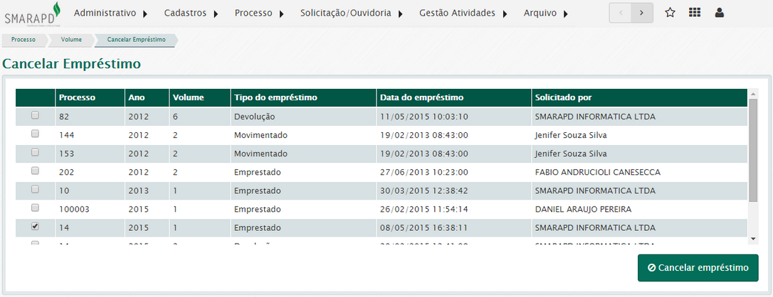 Para cancelar o empréstimo de um volume, acesse o menu Processo / Volumes / Cancelar empréstimo.