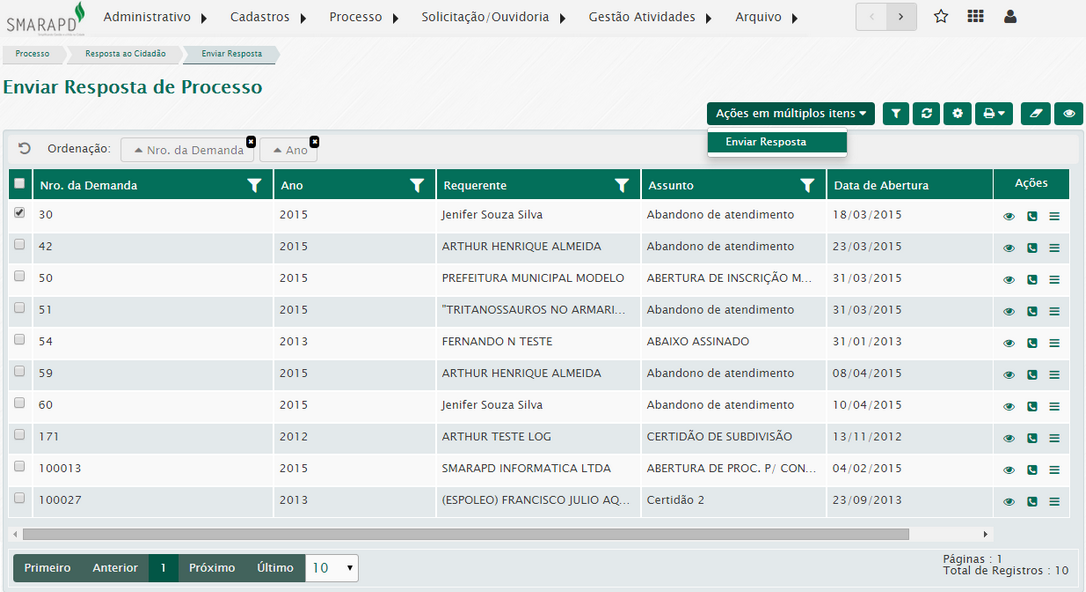 Para enviar a primeira resposta de um processo acesse o menu Processo / Resposta ao cidadão / Enviar resposta.