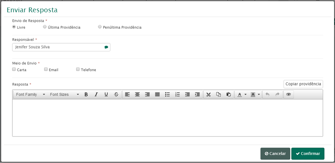 Para enviar uma resposta é necessário selecionar o meio de envio da mesma.