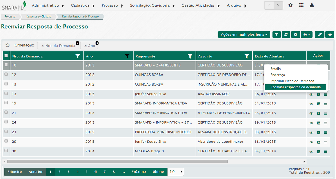 Para reenviar a resposta de um processo acesse o menu Processo / Resposta ao cidadão / Reenviar resposta.