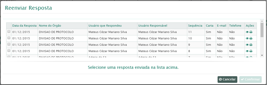 Para reenviar uma resposta é necessário selecioná-la na lista.