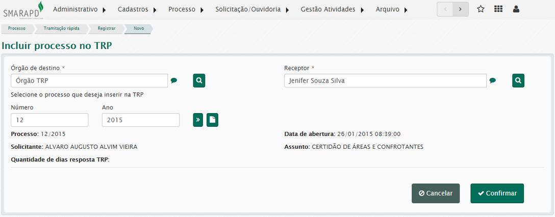A inclusão de um processo na TRP é feita através do menu Processo / Tramitação rápida / Incluir.