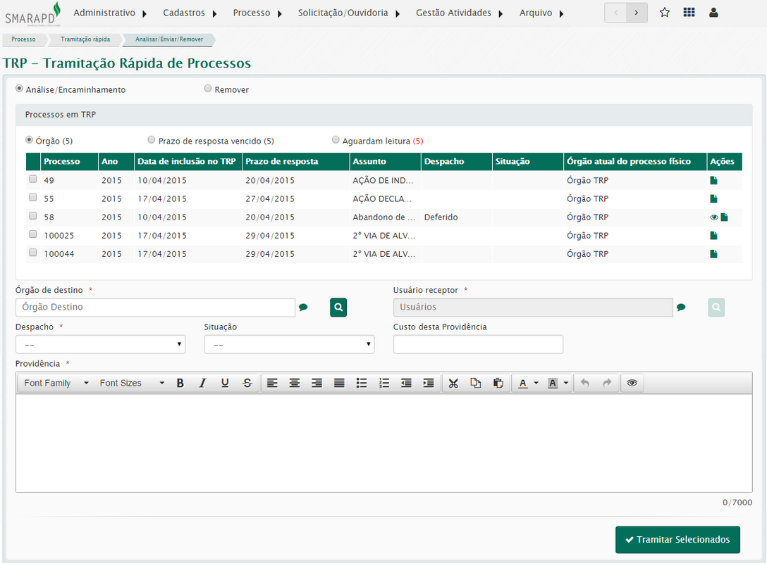 O trâmite ou a remoção de um processo TRP são feitos através do menu Processo / Tramitação rápida / Analisar/Enviar/Remover.