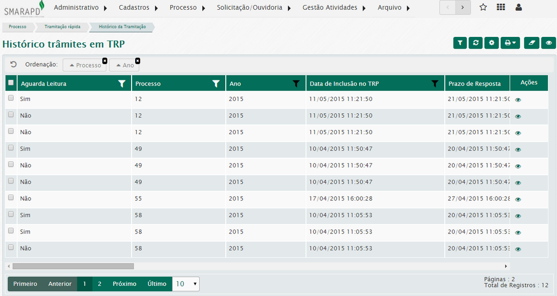 Para visualizar o histórico de movimentação dos processos em TRP acesse o menu Processo / Tramitação rápida / Histórico de movimentação.