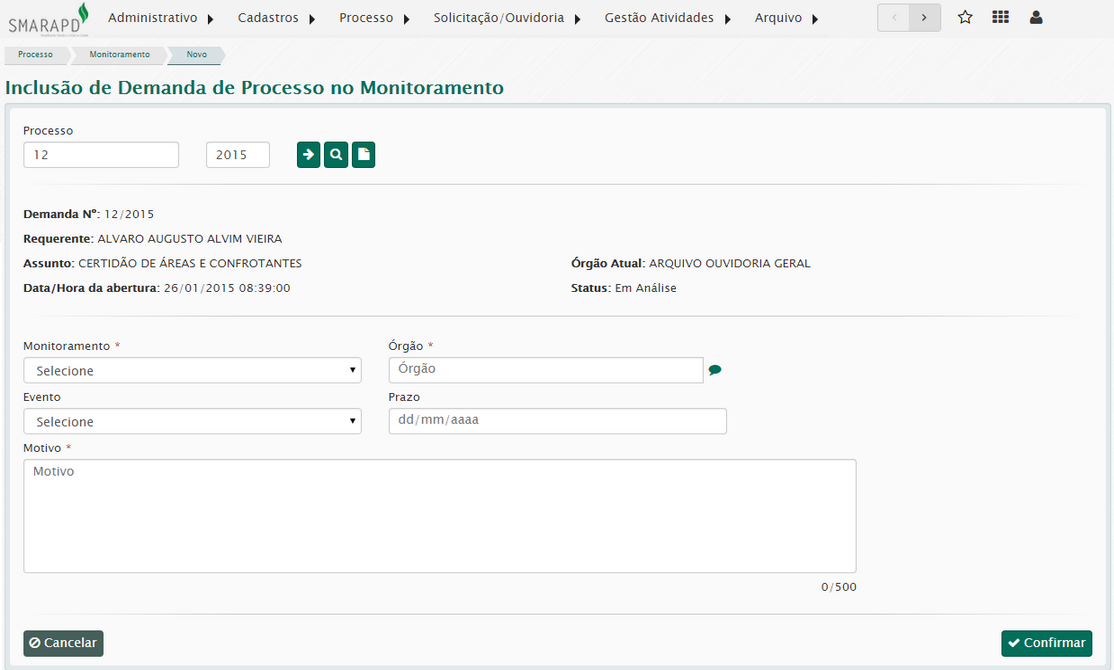 Aqui será possível visualizar o processo, imprimir a ficha de demanda, editar ou excluir o monitoramento.